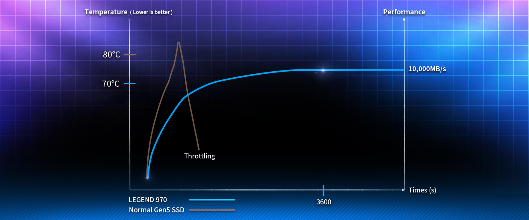 Complete every task in moments. The LEGEND 970 has a sequential read/write speed of 10,000/10,000MB per second, double the speed of PCIe Gen4 SSDs and 6 times faster than Gen3 SSDs, and is fully backward compatible with PCIe 4.0 and 3.0 platforms.