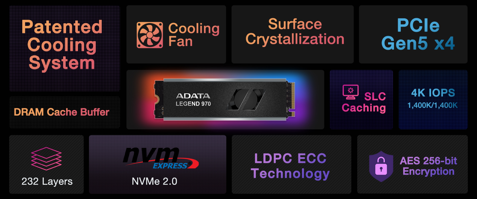 LEGEND 970 leverages the advantages of a SLC cache algorithm and DRAM Cache Buffer while featuring 4K random read/write IOPS up to 1,400K/1,400K, further improving the efficiency of multi-file processing. The LEGEND 970 also adopts a LDPC (Low Density Parity Check Code) error correction mechanism and AES 256-bit high-level encryption technology to ensure the accuracy of data transmission and the security of files.