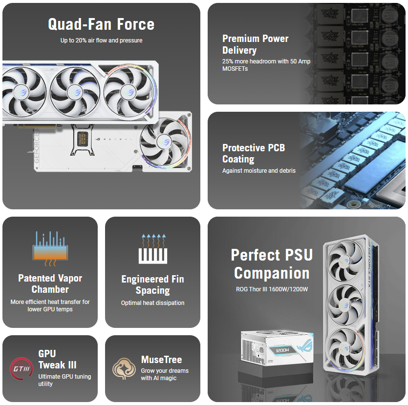 The new ROG Astral family was inspired by the limitless expanse and beauty of the cosmos, and it is a testament to an unending dedication to exploring and defining new frontiers. In that spirit, the ROG Astral GeForce RTX 5080 White Edition introduces ROG’s first quad-fan graphics card, coupled with a patented vapor chamber, increased heatsink fin density, a phase-change GPU thermal pad, towering default clock speeds, boosted power delivery, and more. These premium innovations – amplified by an eye-catching die-cast frame and metal GPU bracket – combine to deliver absolute performance that can handle even the most demanding gaming scenarios.