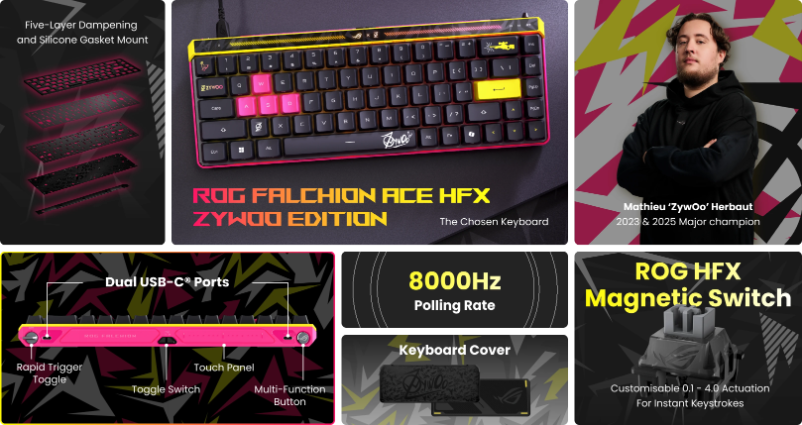 ASUS ROG Falchion Ace HFX Hall Effect Wired Gaming Keyboard, 65% TKL, Dual USB-C, Magnetic Switch, Rapid Trigger, Speed Tap, 8K Hz Polling, Touch Panel, Protective Cover, PBT Keycaps – ZywOo Edition