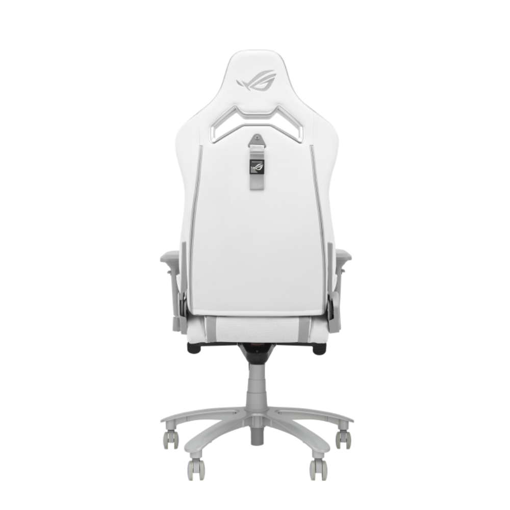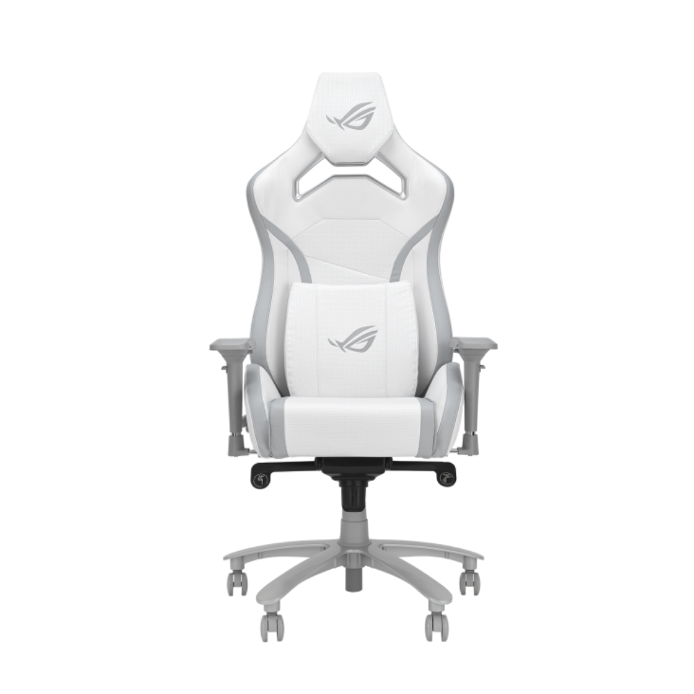ROG Chariot X Core gaming chair in racing-car style, featuring an adjustable high-density foam headrest, memory-foam lumbar support, 4D armrests, tilt mechanism, durable class 4 gas lift, and durable premium PU leather for a premium gaming experience.