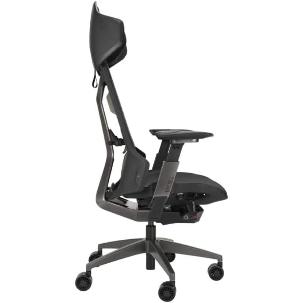 ROG Destrier Ergo Gaming Chair with futuristic cyborg aesthetic, versatile seat adjustments for the perfect posture, mobile gaming arm support mode, and acoustic panel for less distraction and more immersive gaming experience.