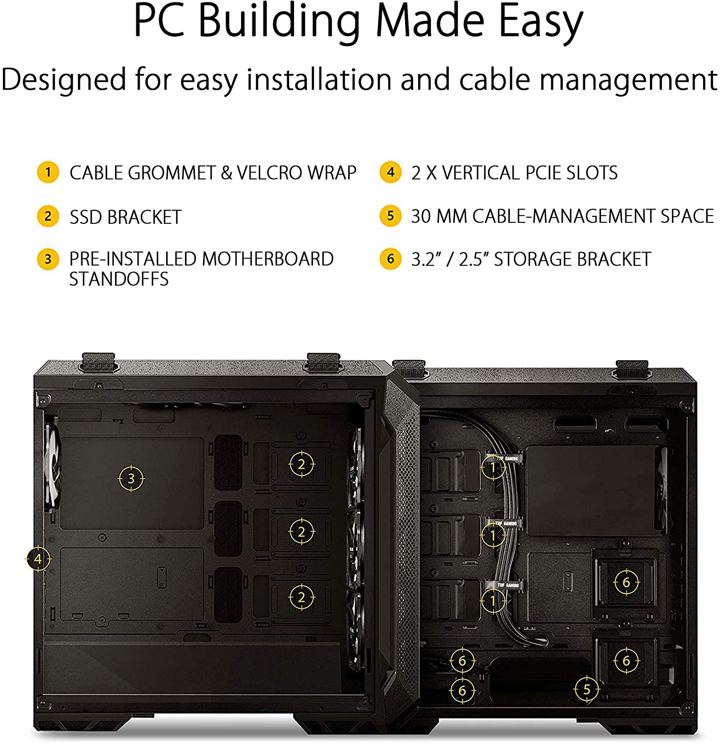 - Designed to be noticed: Metal front panel with custom TUF Gaming spatter pattern, and 4mm-thick, smoked, tempered-glass side panel to showcase your build’s internals.