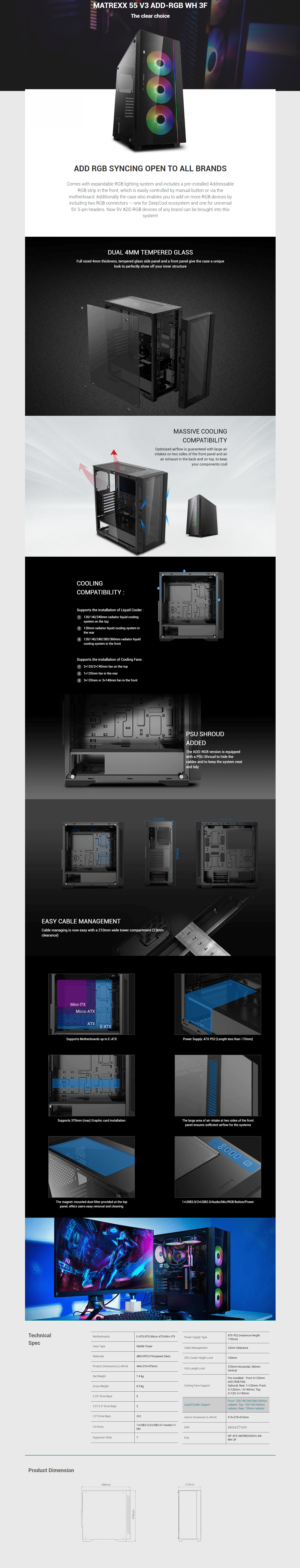 The DeepCool Matrexx 55 V3 ADD RGB 3F Full Sized Tempered Glass With 3 Fans is a performance mid-tower ATX case with dual 4mm tempered glass side and front panel to showcase your build in spectacular form featuring an A-RGB LED strip and 3 included A-RGB fans.