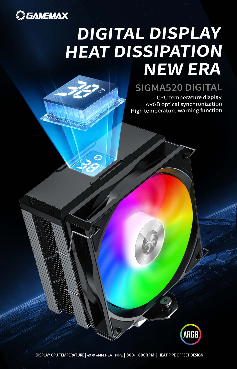 GameMax Sigma 520 Digital BK Tower CPU air cooler, Painted Black, Fours thermal tubes, Supports Intel Gen12, 13 CPUs and AMD latest model, ARGB lighting effects.