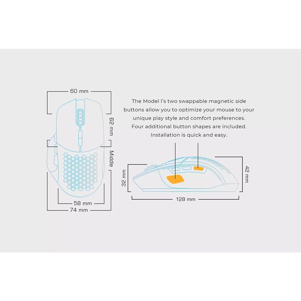 Model I Gaming mouse from Glorious combines versatility and comfort in one. This impressive customizable gaming mouse incorporates a spectacular set of technology in an ultra-light, ergonomic right-handed shape. Its total of 9 buttons are fully programmable for personal control in FPS, MMO and MOBA games. Model I weighs only 69g (nice) which is perfect for the long game nights.