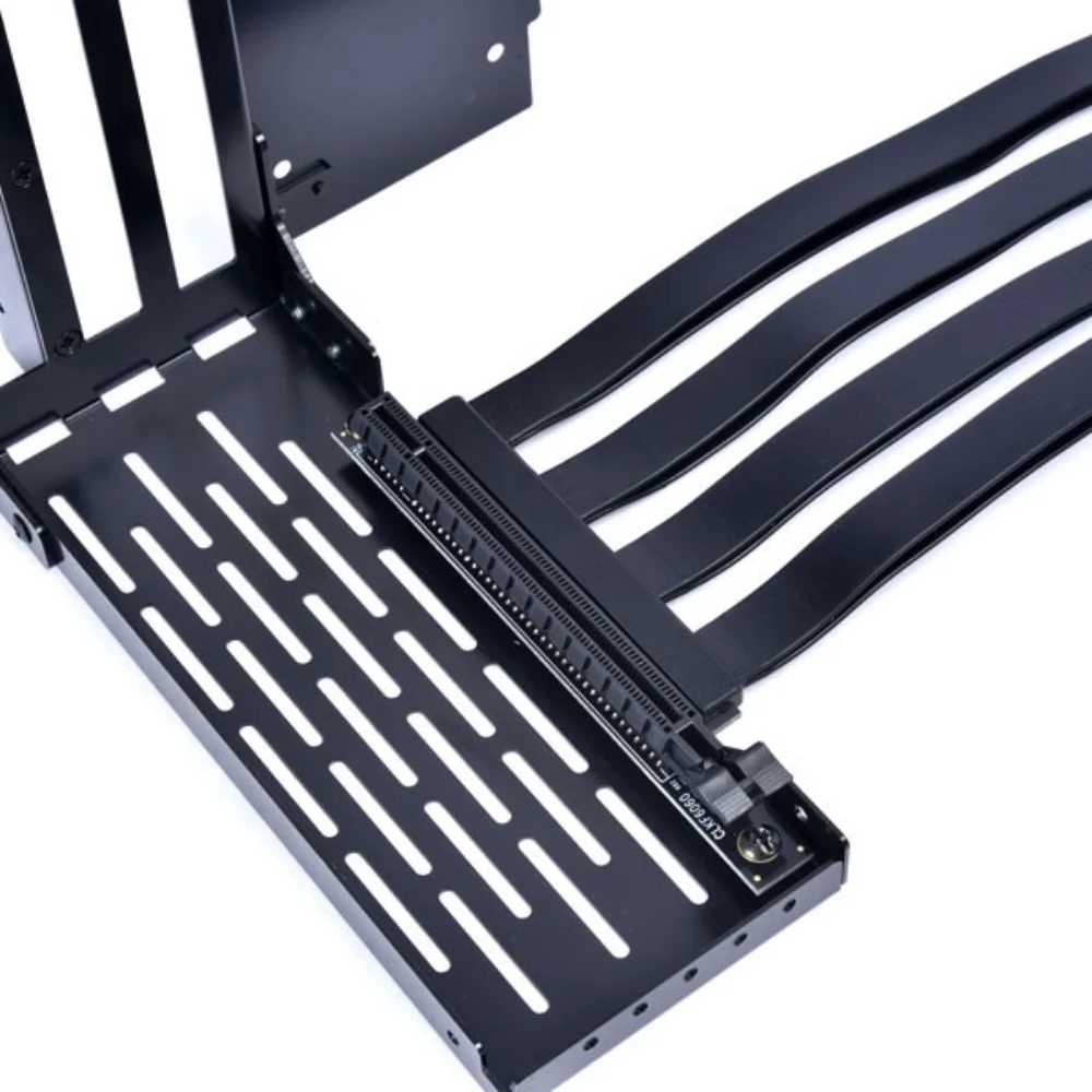 Vertical Graphics Card Holder for LANCOOL II with PCI-E Riser Cable. Allows you to vertically display graphics cards while still having room for 2 x 120mm fans. Mounted underneath to create an unobstructed airflow. Included PCI-E riser cable.