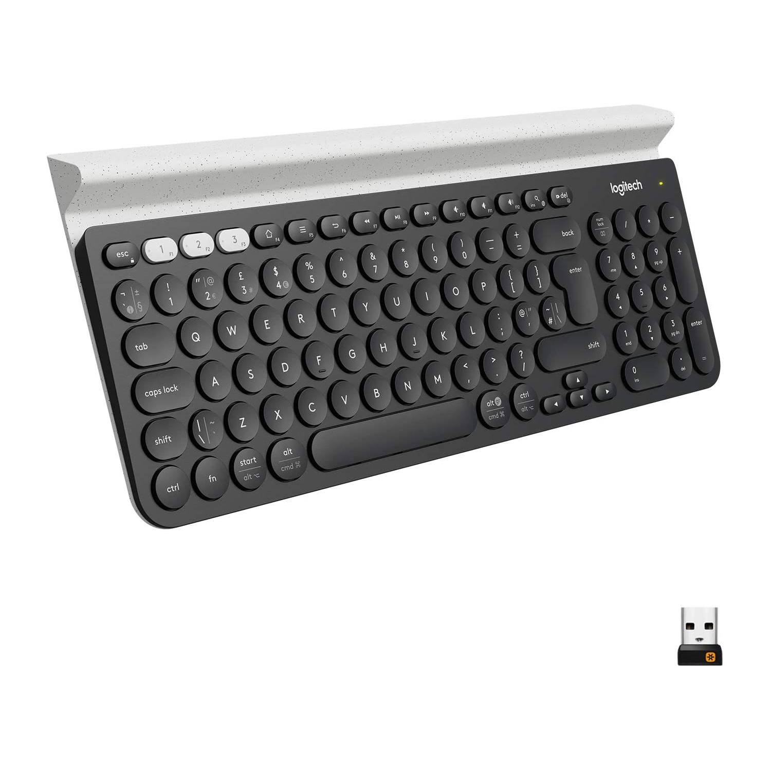 This Logitech K780 Multi Device Wireless Keyboard can be used with your computer, phone or tablet allowing you to type comfortably. Enjoy quiet typing and remain connected to several devices at once, so you can switch between your phone or tablet at the touch of a button. It features a rubber stand to hold your devices within reach and at the perfect angle and a numbers pad for your convenience.