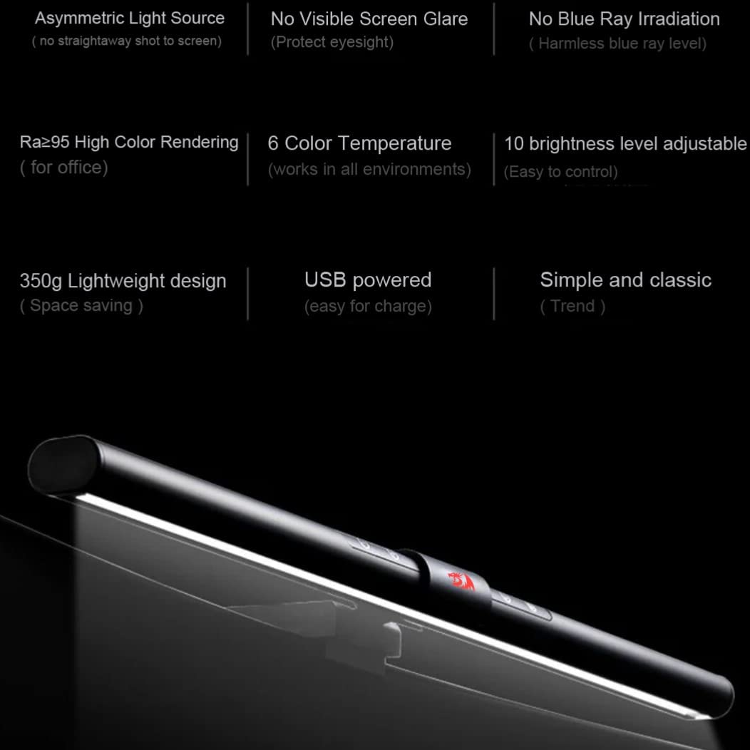- Aluminum Monitor Light Bar – Redragon LED screen lamp with durable aluminum is dedicated for deadline-work and stay-up gamer, 2 different lights (warm/light) significantly improves focus at work and offers immersive vibe for gamer.