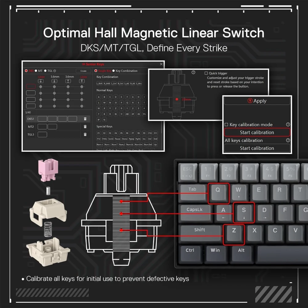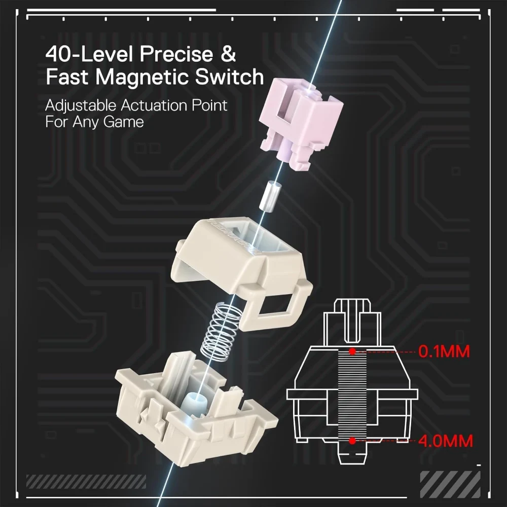 - Rapid Trigger Tech – Combine the Hall magnetic switch with rapid trigger ON via software, the actuation point can be 0.1mm precision adjusted between 0.3-4.0 mm (The actual effect of the 0.1-0.2 mm actuation point may be affected by the normal tolerances of the components), ultra-precise actuation point combo with dynamic activation/deactivation defines your one-tap-kill.