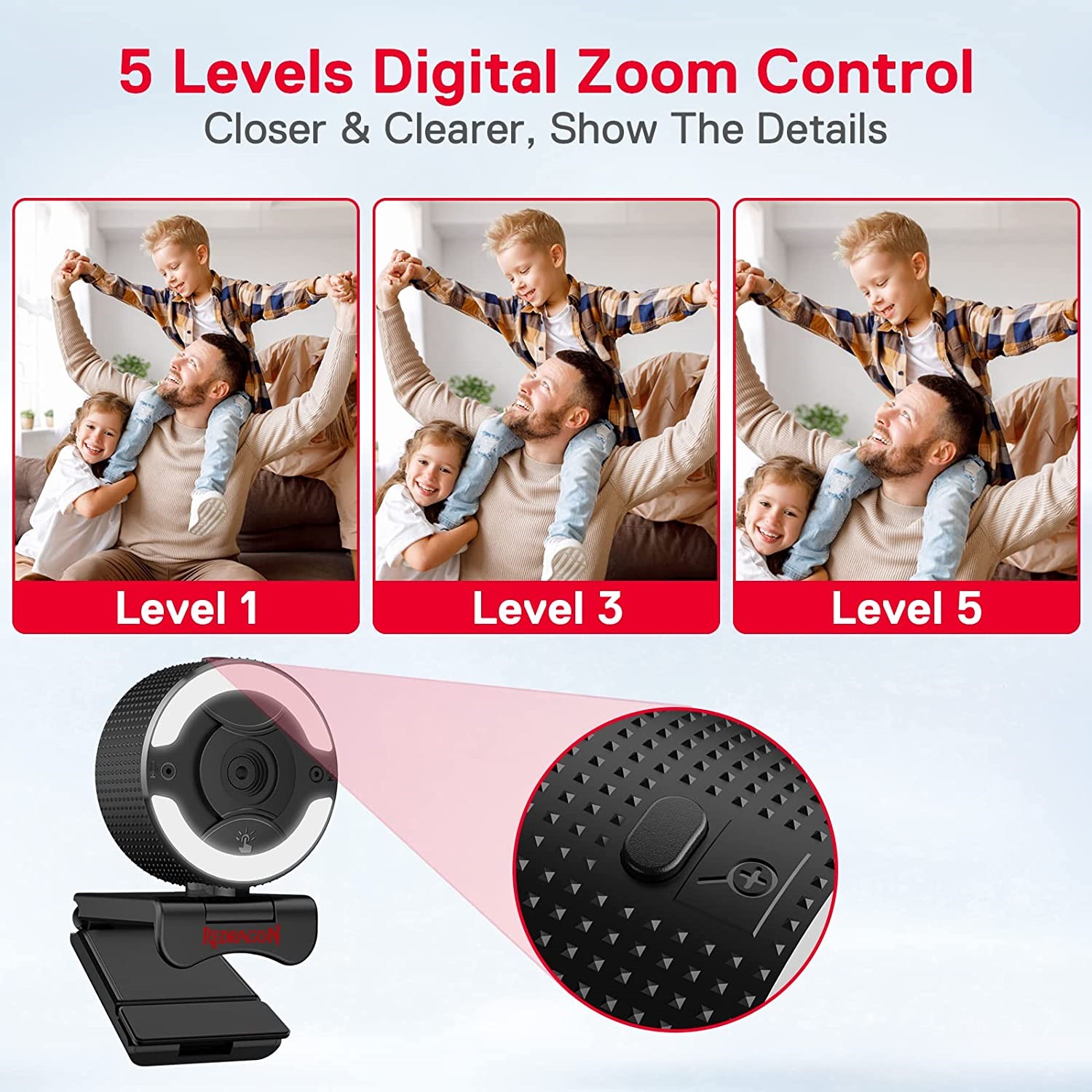 - 5 Levels Digital Zoom – With up to 5x digital magnification, you can adjust the field of view to just focus on what you want. GW910 helps you capture more crystal-clear details and colors in video chatting.