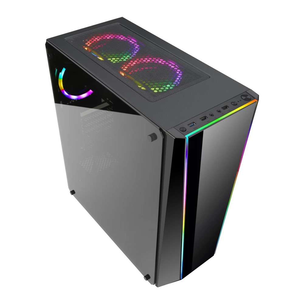 - Pre-installed 5 fans:2 black fans without light in front, 2 RGB FANS on top,1 RGB fan at the rear