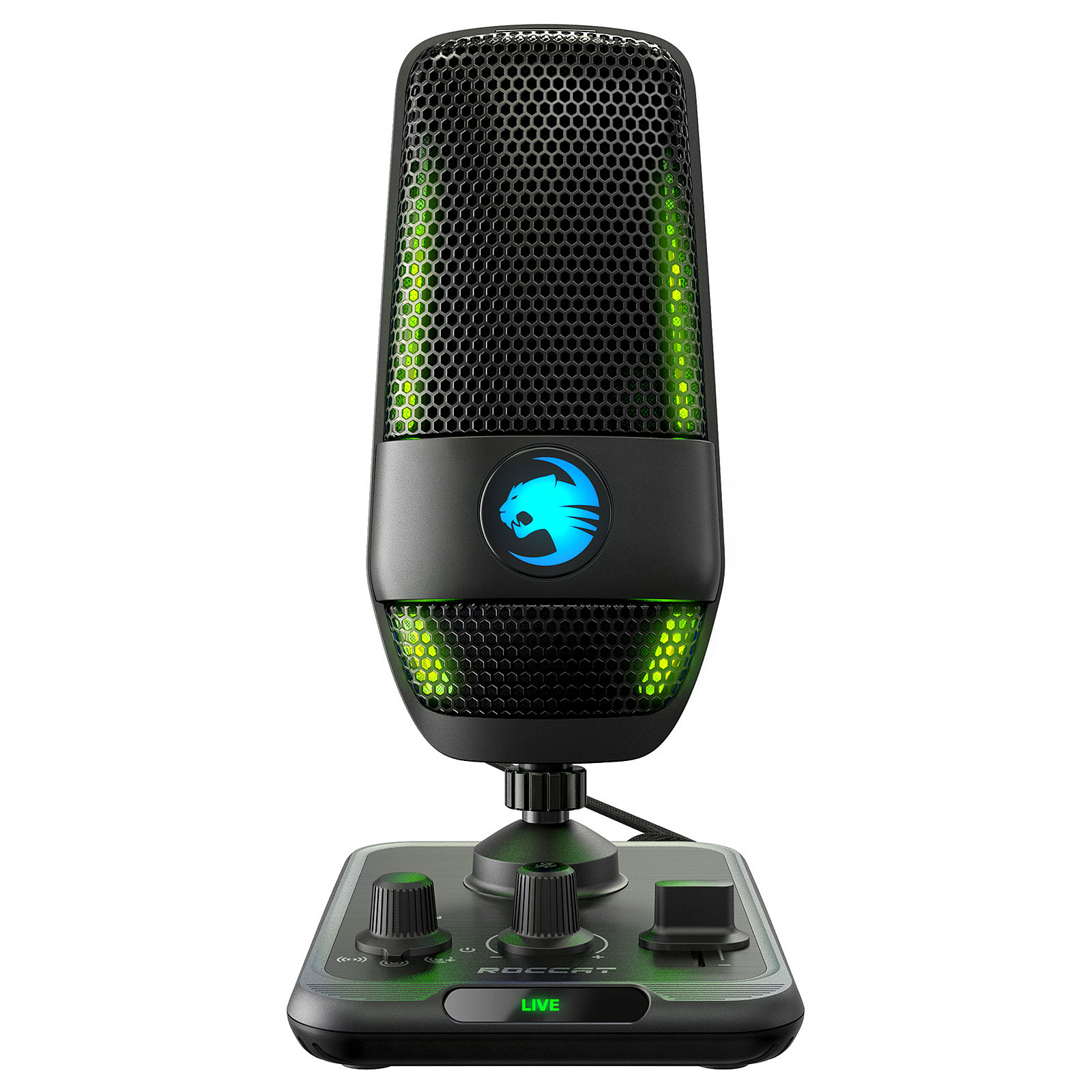 Meet the ROCCAT® Torch™ Studio-Grade USB Microphone. The dual condenser design and 24-Bit audio quality will take your content to the next level. Cardioid, Stereo and exclusive Whisper pick-up patterns give you the tools to create anywhere.