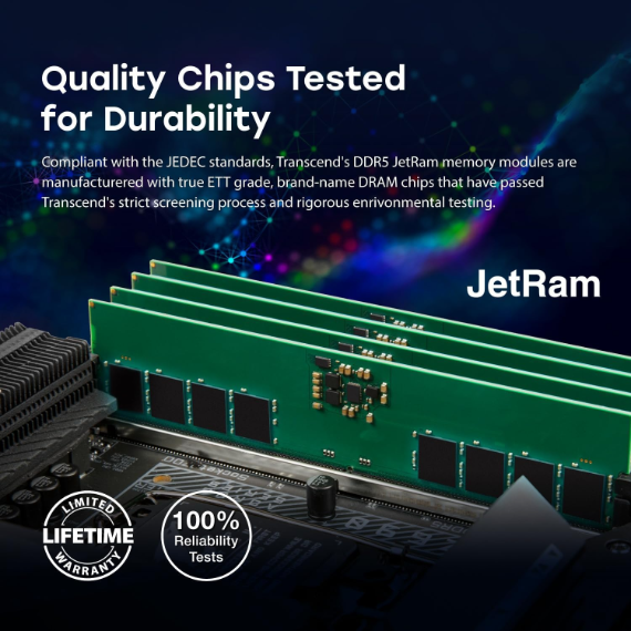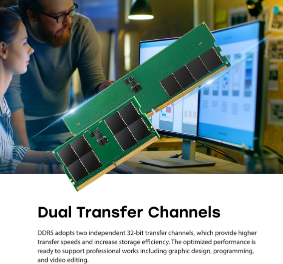 Compliant with JEDEC international standards, Transcend’s new-gen DDR5 JetRam memory modules are manufactured with true ETT grade, brand-name DRAM chips that have passed Transcend’s strict screening process and rigorous environmental testing. DDR5 features two independent 32-bit channels that bring speeds to 5,600 MT/s. 1.1V low working voltage and PMIC effectively reduce signal interruption while cutting down power consumption for your computer. On-die ECC automatically spots and corrects data errors, enhancing data integrity and system stability.