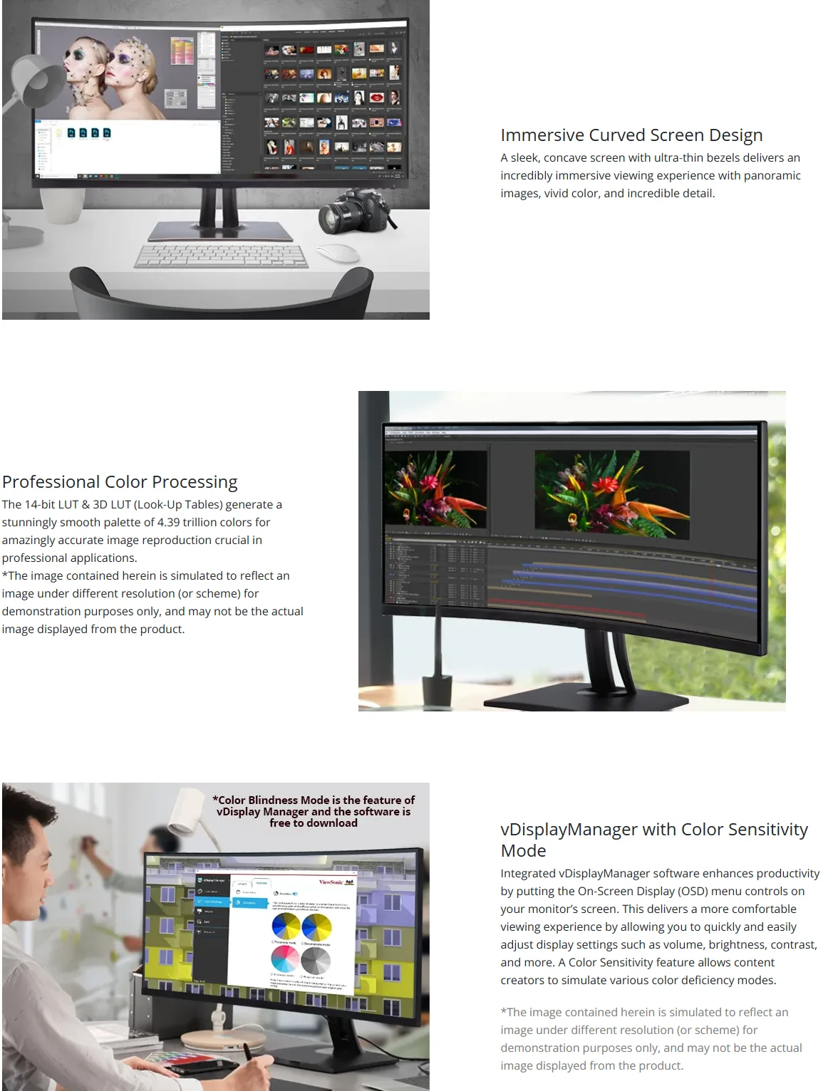 With an immersive curved screen and stunning UWQHD+ 3440 x 1440 resolution, the ViewSonic VP3481a monitor elevates your viewing experience from flat to panoramic. With Pantone validated 100% sRGB color coverage, and an amazing Delta E<2 value, this 4K monitor provides industry standard color accuracy to ensure superior results, while HDR10 compatibility delivers a wider dynamic range of vivid colors and richer contrast. Thanks to an expansive 34” frameless screen, ultra-wide 21:9 aspect ratio, and integrated speakers, this monitor is ideal for video editing, content development, and other color-critical applications. Featuring an incredible 100Hz refresh rate and AMD FreeSync™ technology, this monitor delivers smooth, tear-free playback ideal for video editors and game developers. With a sleek and modern design, the VP3481a features a future-proof USB-C port as well as DisplayPort technology, and HDMI. What’s more, HDCP 2.2 content protection is standard across all ports to provide secure 4K content playback, streaming and gaming. An integrated color uniformity function ensures consistent chromaticity across the screen, while a 14-bit 3D look-up table generates a stunningly smooth palette of 4.39 trillion colors. Hardware calibration is also available with the optional ViewSonic Colorbration Kit, which allows you to quickly and easily calibrate the monitor for photography, graphic design, and other professional applications.