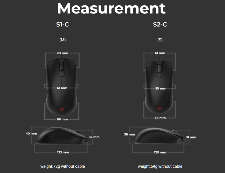 ZOWIE S2-C Esports Wired Gaming Mouse, Small, 3200 DPI, PAW3360 Sensor – Black